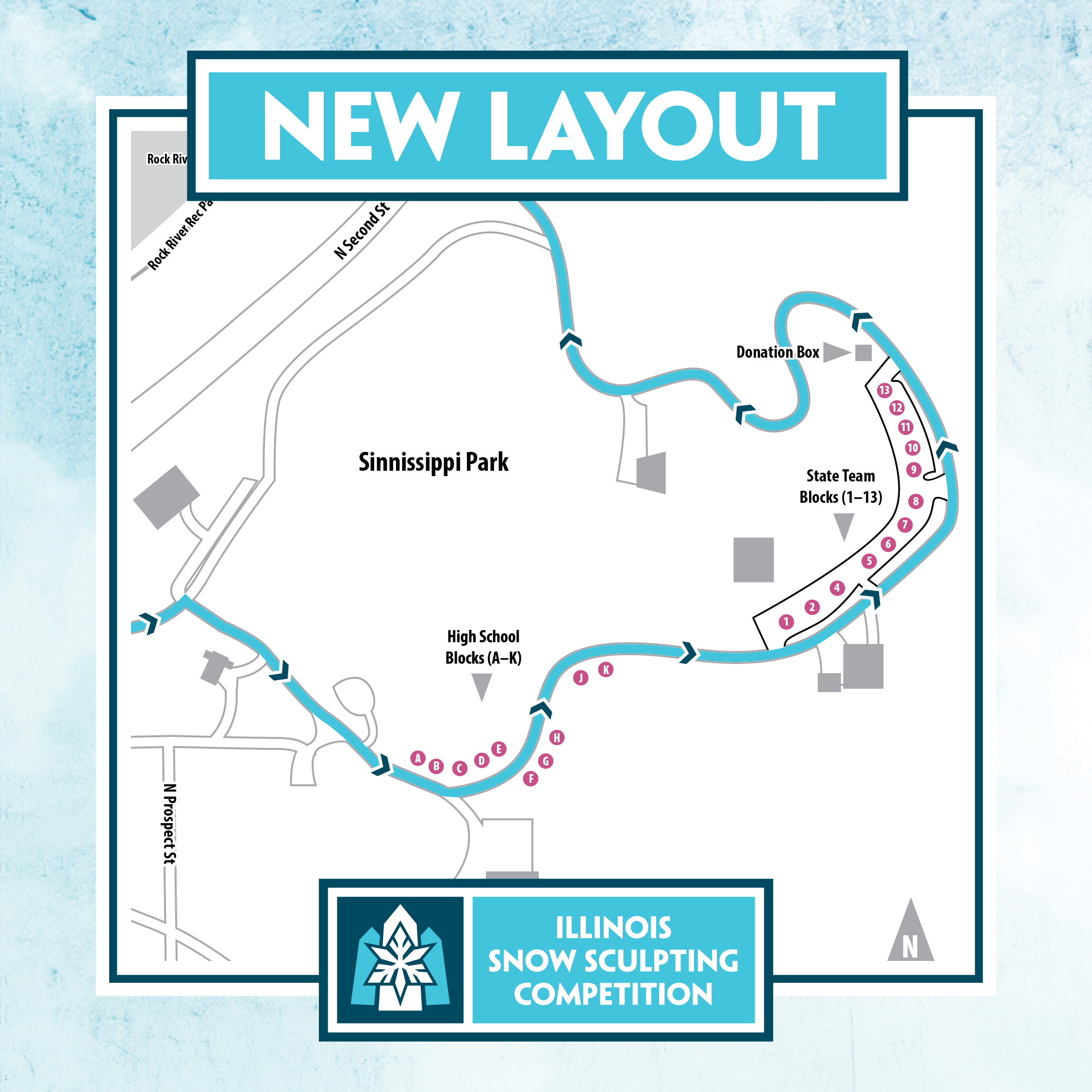Heads up! We’ve introduced a new traffic pattern for the Illinois Snow Sculpting Competition. This change allows our state teams to work on a flat surface and even the playing field. Having everyone in one spot also greatly reduces risk for the artists, especially as many use scaffolding and tall ladders.